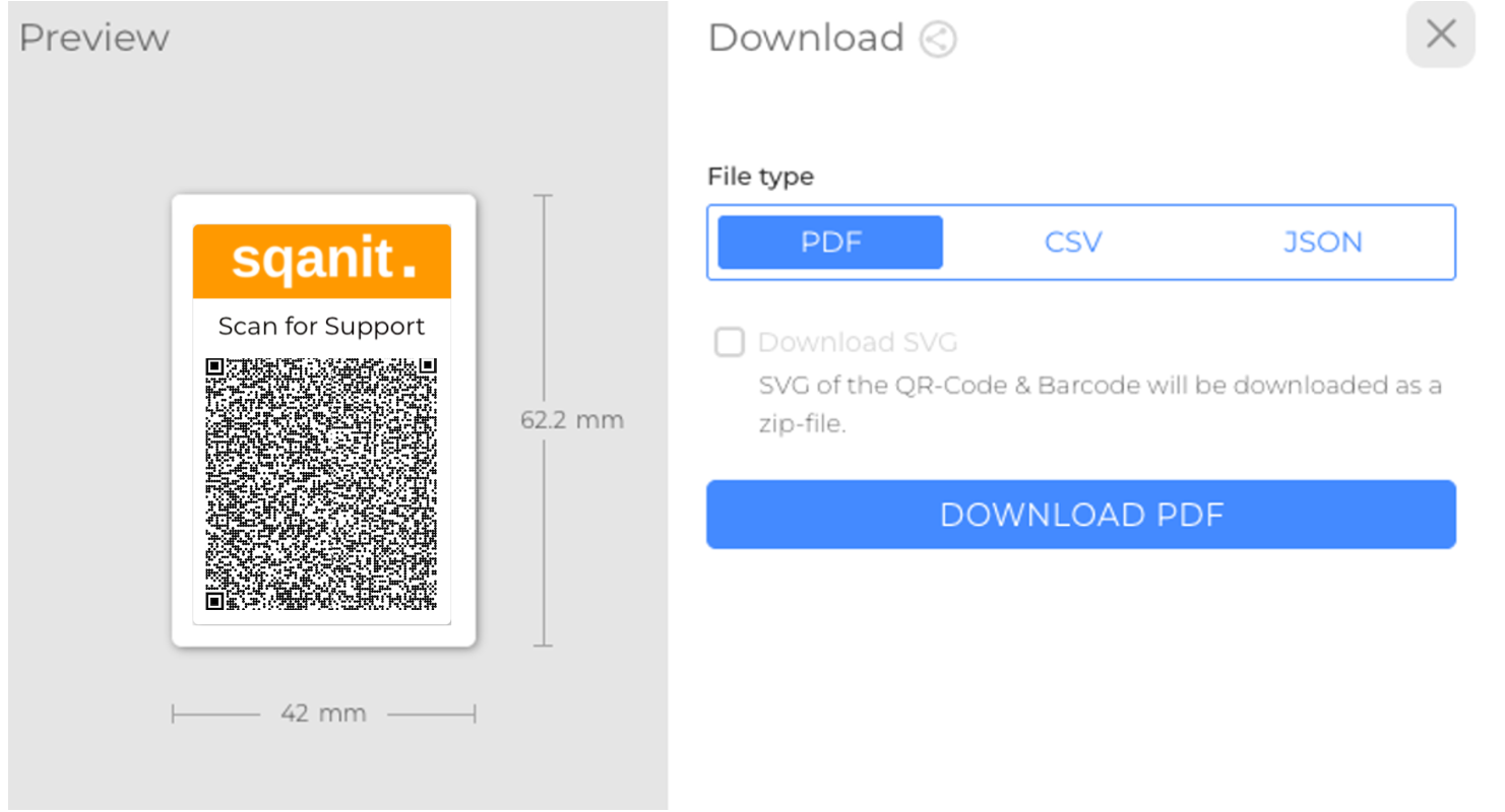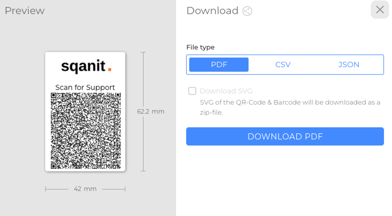 In the Code view, export of the Code via CSV, JSON or print-optimized PDF file is made possible. The PDF maintains full image quality consisting of associated QR or barcode and can be used for documentation, labeling, or printing purposes, and is ideal for lossless printing or sharing in printed form.
