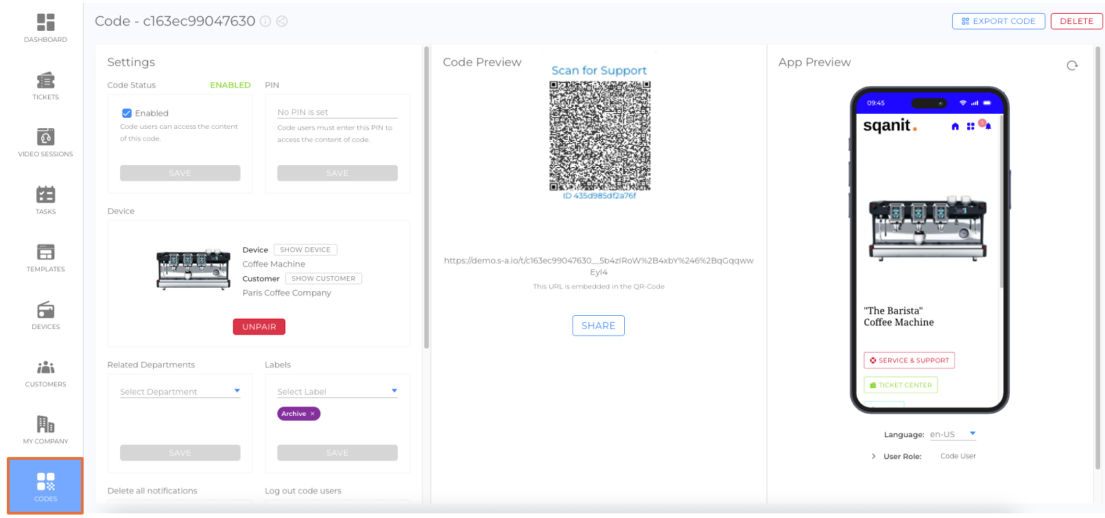 The Code Details View provides detailed information about individual codes and allows users with the right permission to manage them.