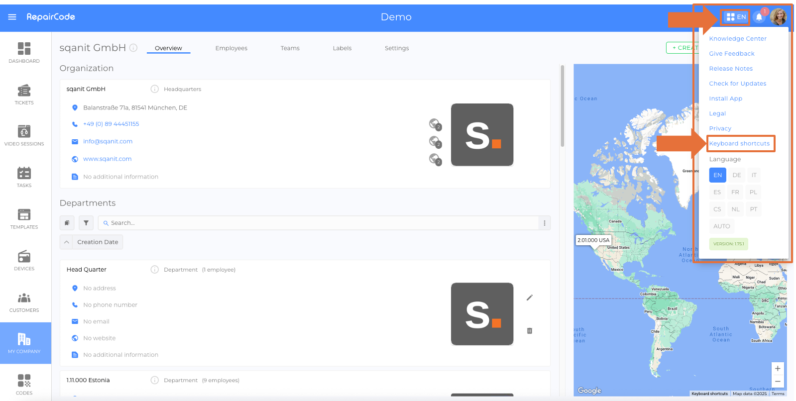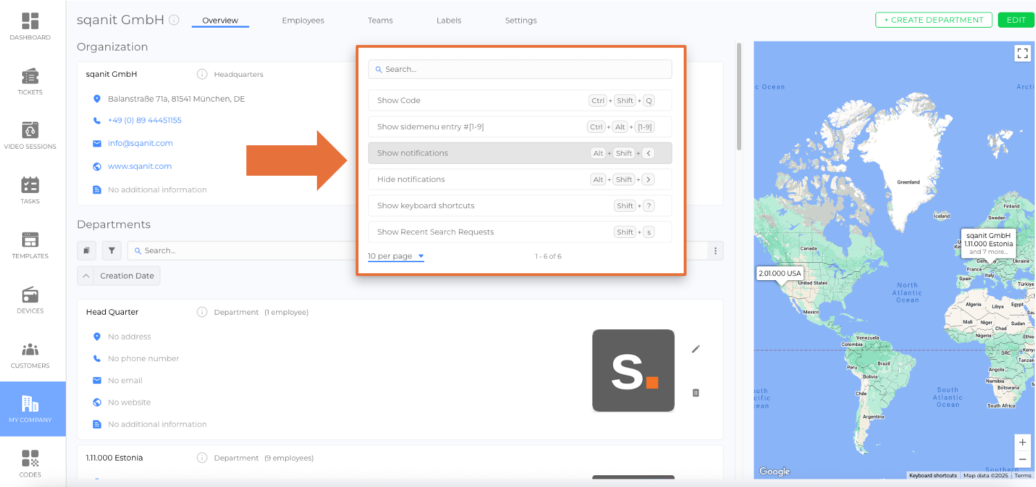 The Keyboard Shortcuts button in the help menu opens a panel listing all shortcuts currently available in your sqanit Back Office.