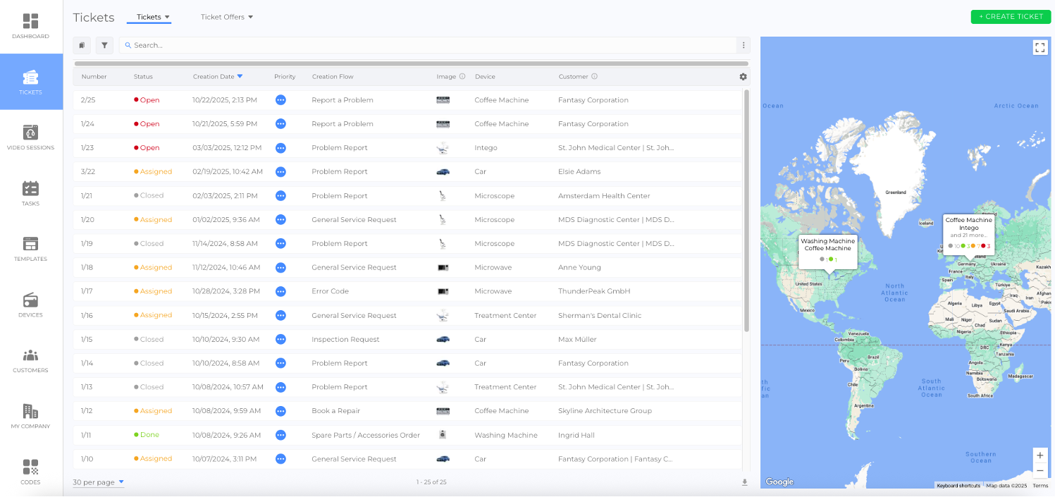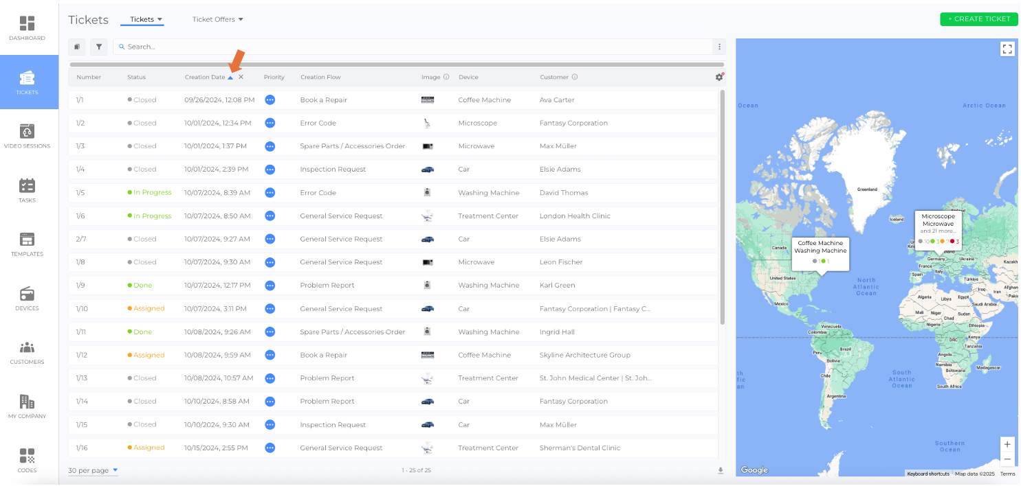 All list views consist of tailored filtering capabilities. Depending on the module, entries can be filtered more precisely — for example by status, creator, label, or date. More filter options have also been added to simplify searching and sorting within large datasets. These improvements apply to multiple modules, including Tickets, Tasks, Devices, and Customers.