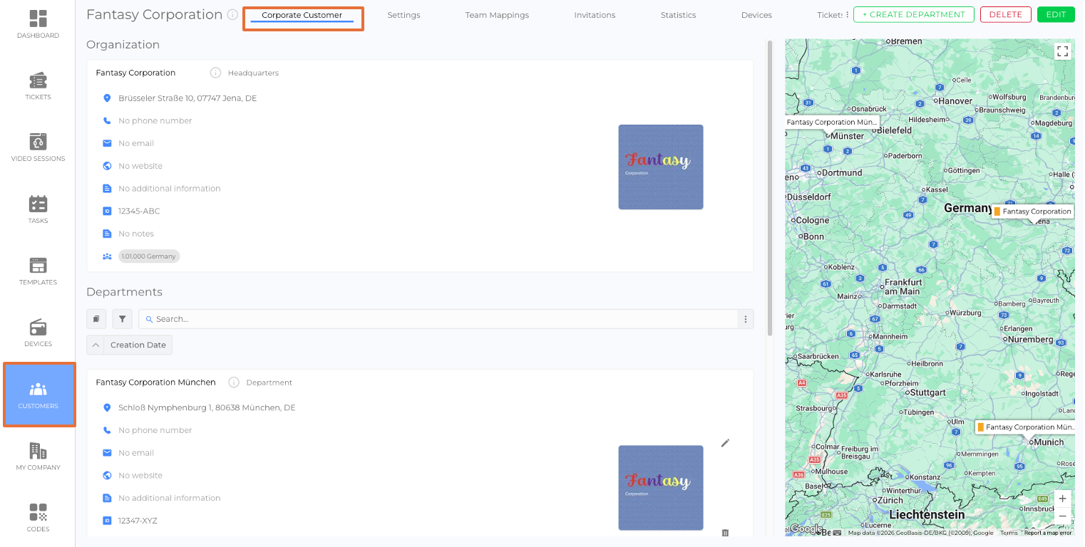 The Customers Tab provides a structured list of all Private Customers and Corporate Customers stored on the platform. Employees can: