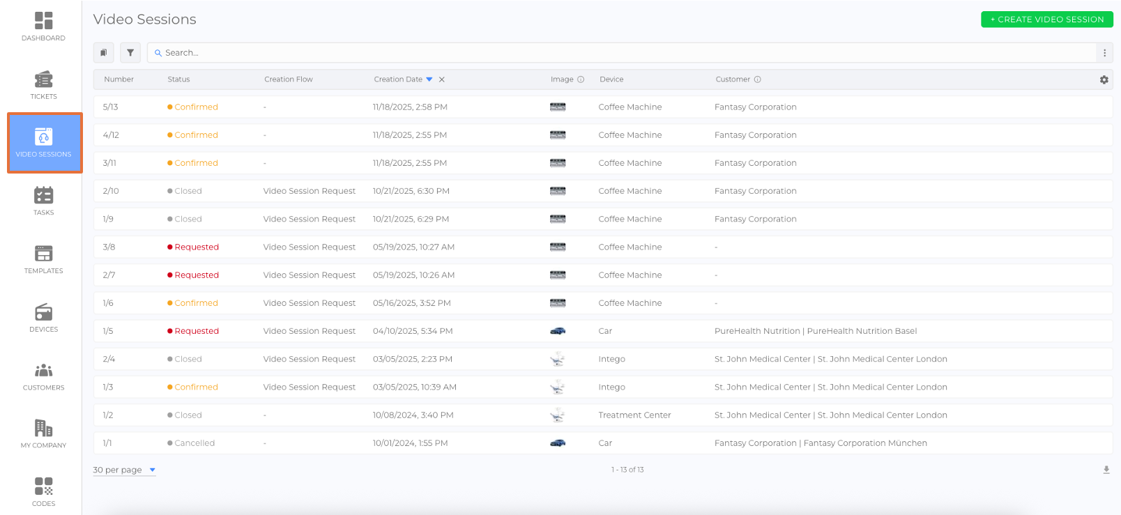 The Video Sessions Tab provides access to a comprehensive list (article) of all video sessions on the platform, enabling employees to manage remote support efficiently. Employees can create new sessions, view detailed session information, and track progress, while leveraging advanced tools like augmented reality (AR) features and session recordings for seamless customer assistance.