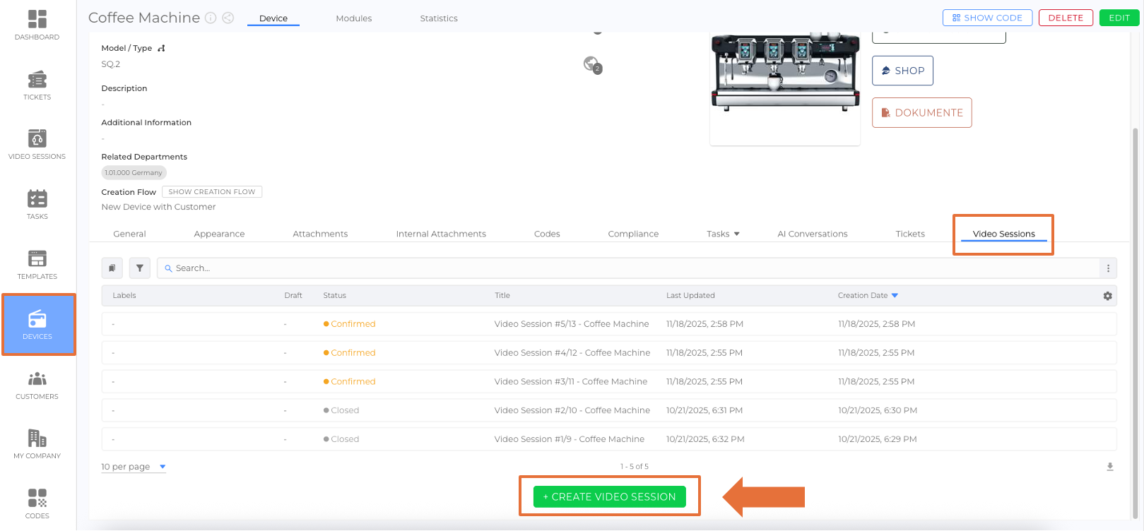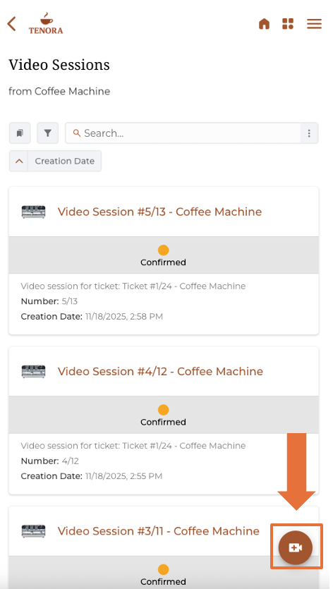 - Device Details View: Navigate to the Video Sessions Tab within the device details view and click + Create Video Session. (picture)