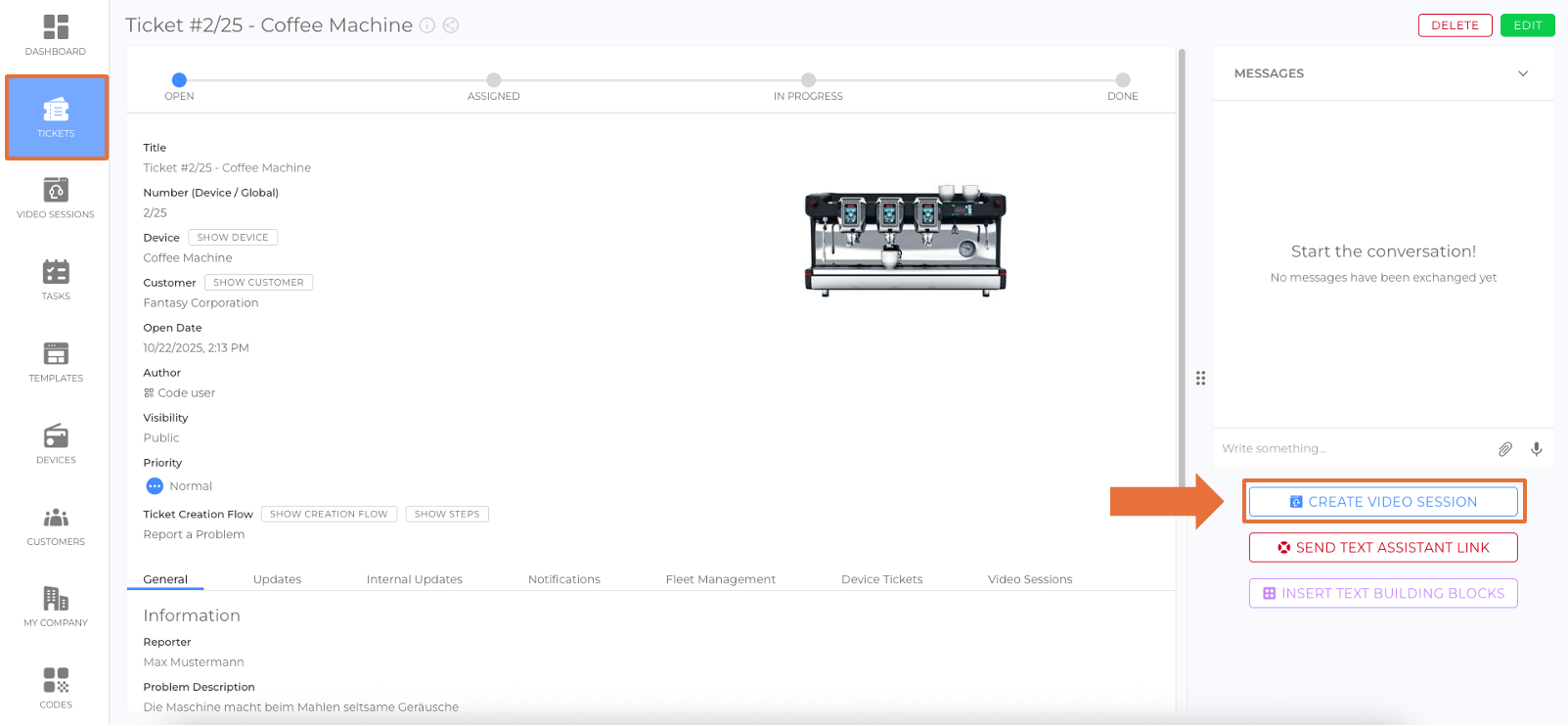 - Messenger (Ticket Details View): Click the + Create Video Session button located under the Messenger. (picture)