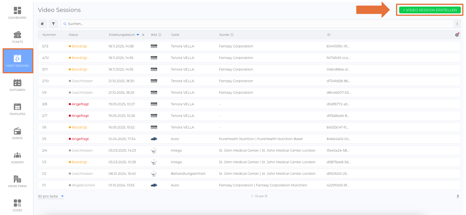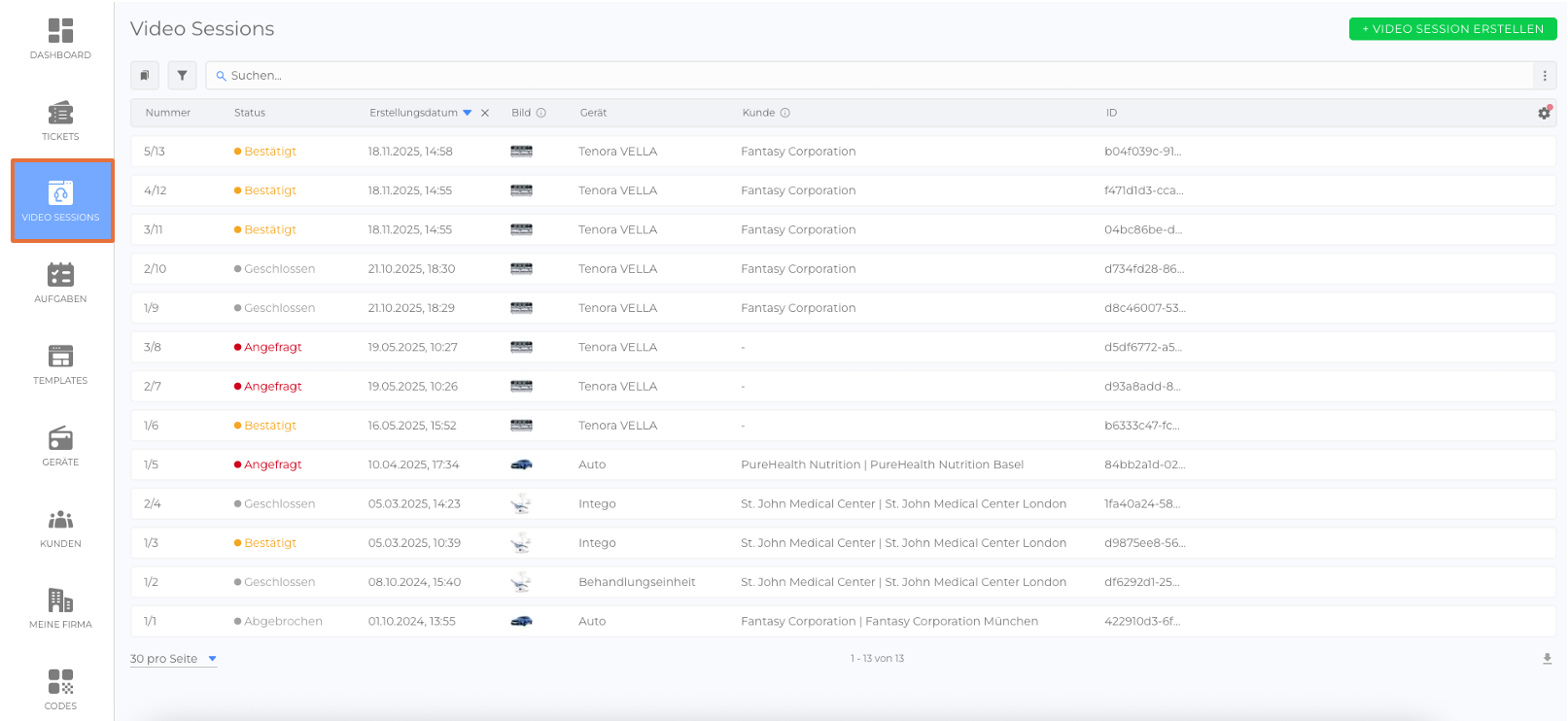 Der Video Sessions-Tab bietet Zugriff auf eine umfassende Liste (Artikel) aller Video Sessions auf der Plattform, sodass Mitarbeitende Remote-Support effizient verwalten können. Mitarbeitende können neue Sessions erstellen, detaillierte Informationen einsehen und den Fortschritt verfolgen. Mithilfe fortschrittlicher Tools wie Augmented-Reality-Funktionen (AR) und Sitzungsaufzeichnungen wird eine nahtlose Kundenbetreuung gewährleistet.
