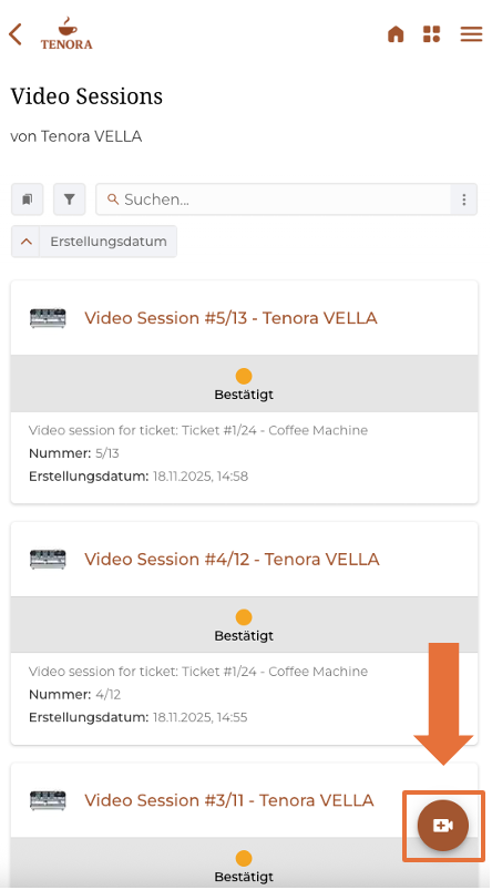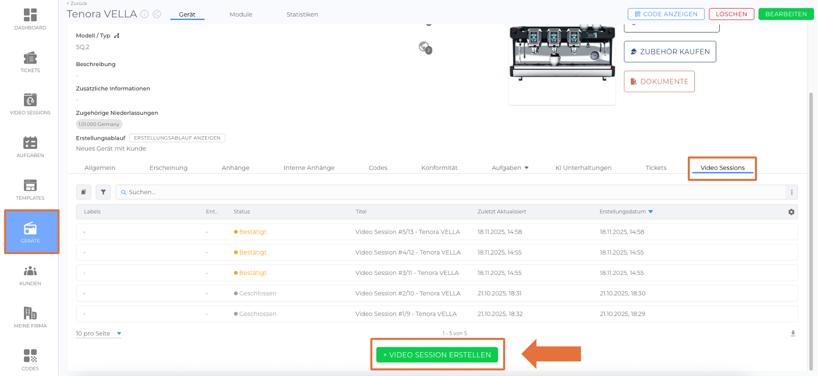 - Geräte-Details-Ansicht: Navigieren Sie zum Video Sessions-Tab in der Geräte-Details-Ansicht und klicken Sie auf + Video Session erstellen. (Bild)