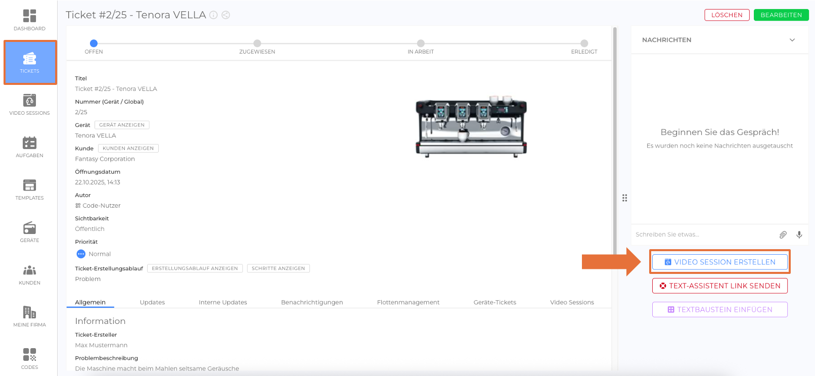 - Messenger (Ticket-Details-Ansicht): Klicken Sie auf die Schaltfläche + Video Session erstellen im Messenger. (Bild)