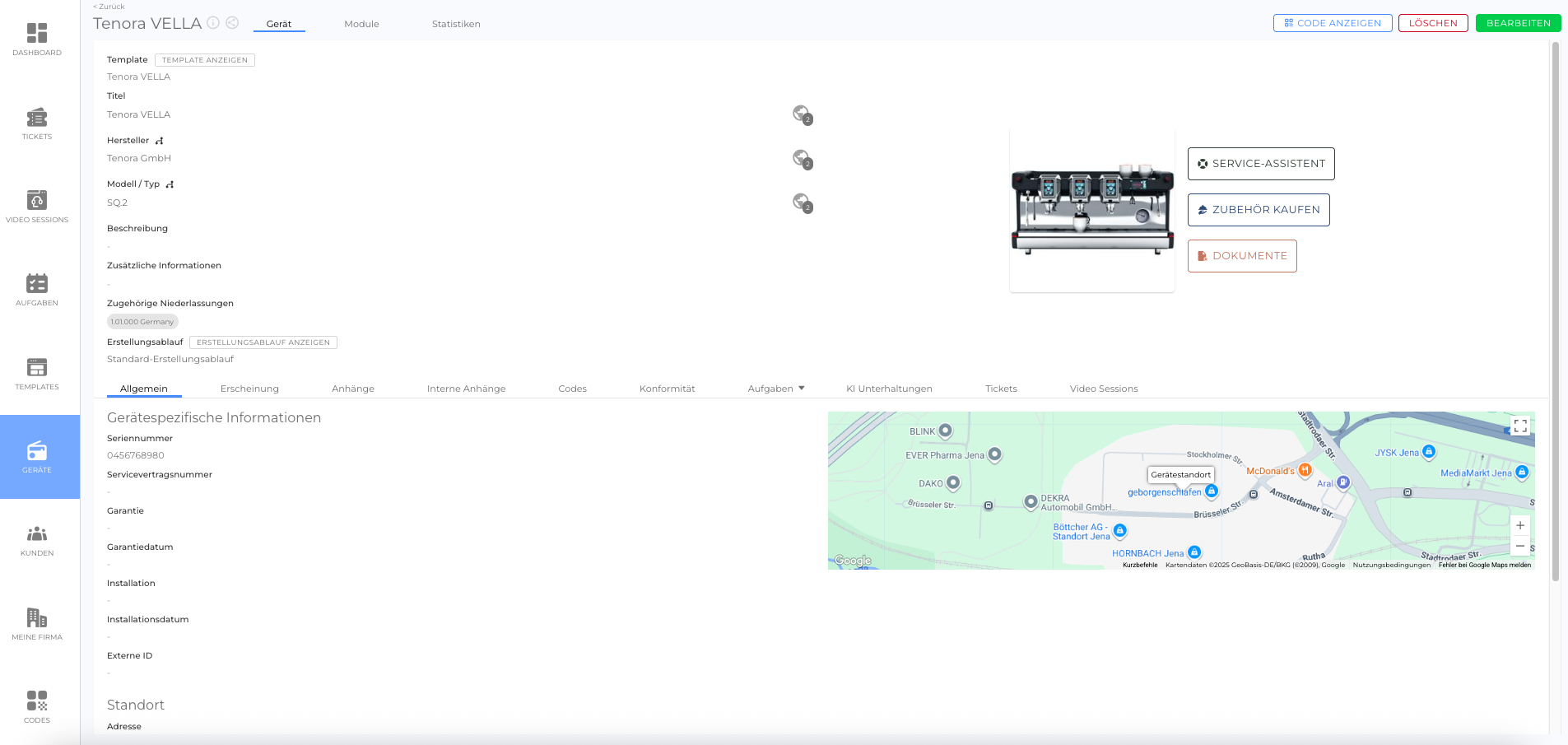 Die Geräte-Detailansicht bietet eine zentrale Übersicht zur Verwaltung einzelner Geräte. Diese Ansicht ermöglicht Serviceanbietern und Kundenlogin-Nutzer den Zugriff auf gerätebezogene Daten, die Überwachung von Aktivitäten und die Konfiguration von Einstellungen, um ein nahtloses Management und effiziente Workflows zu gewährleisten.