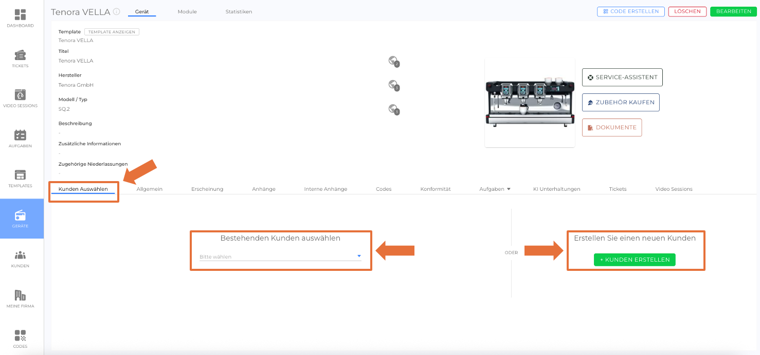 Der Benutzer hat dabei die Möglichkeit, einen bestehenden Kunden über das Dropdown-Menü Bestehenden Kunden auswählen auszuwählen oder über die Schaltfläche + Kunden erstellen einen neuen Kunden für das Gerät anzulegen.