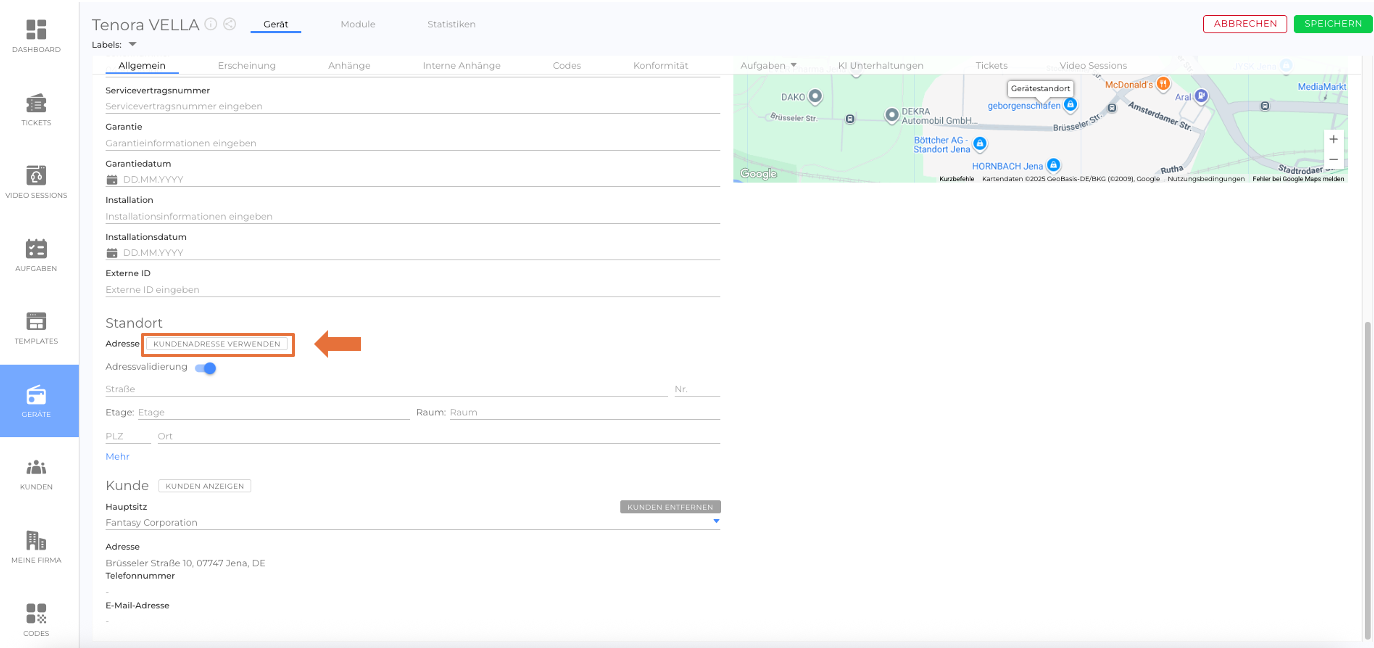 Wenn der verknüpfte Kunde eine eigene Adresse hinterlegt hat, werden durch Klicken auf diese Schaltfläche die Adressfelder des Geräts automatisch mit der Kundenadresse ausgefüllt.