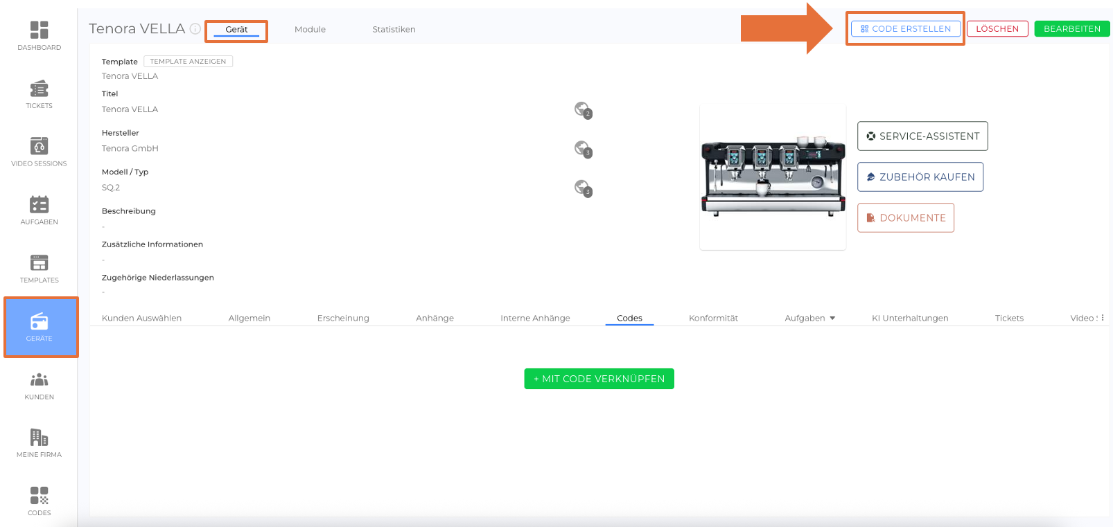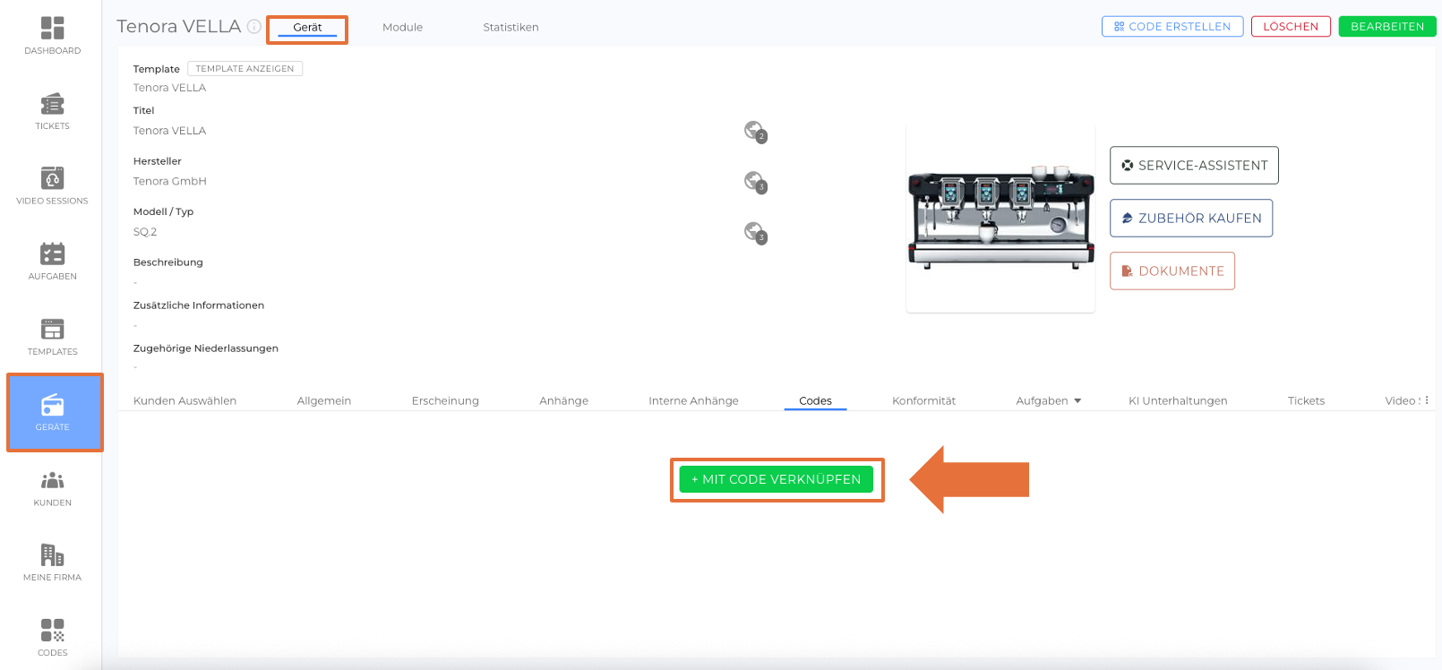 Dieser Tab zeigt den mit dem Gerät verknüpften Code an. Durch Klicken auf den verknüpften Code gelangen Sie zur Code-Detailansicht, wo Sie weitere Informationen anzeigen oder Aktionen ausführen können.