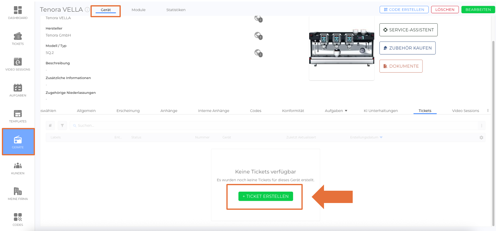 Der Tickets-Tab zeigt alle mit dem Gerät verknüpften Tickets an. Durch Klicken auf ein Ticket gelangen Sie zur Ticket-Detailansicht, wo Sie das Ticket verwalten oder überprüfen können.