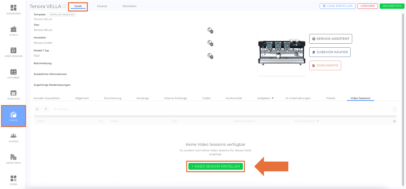 Der Video Sessions-Tab listet alle Video Sessions auf, die mit dem Gerät verknüpft sind. Durch Klicken auf eine Video Session gelangen Sie zur Video Session-Detailansicht, wo Sie die Session verwalten oder überprüfen können.