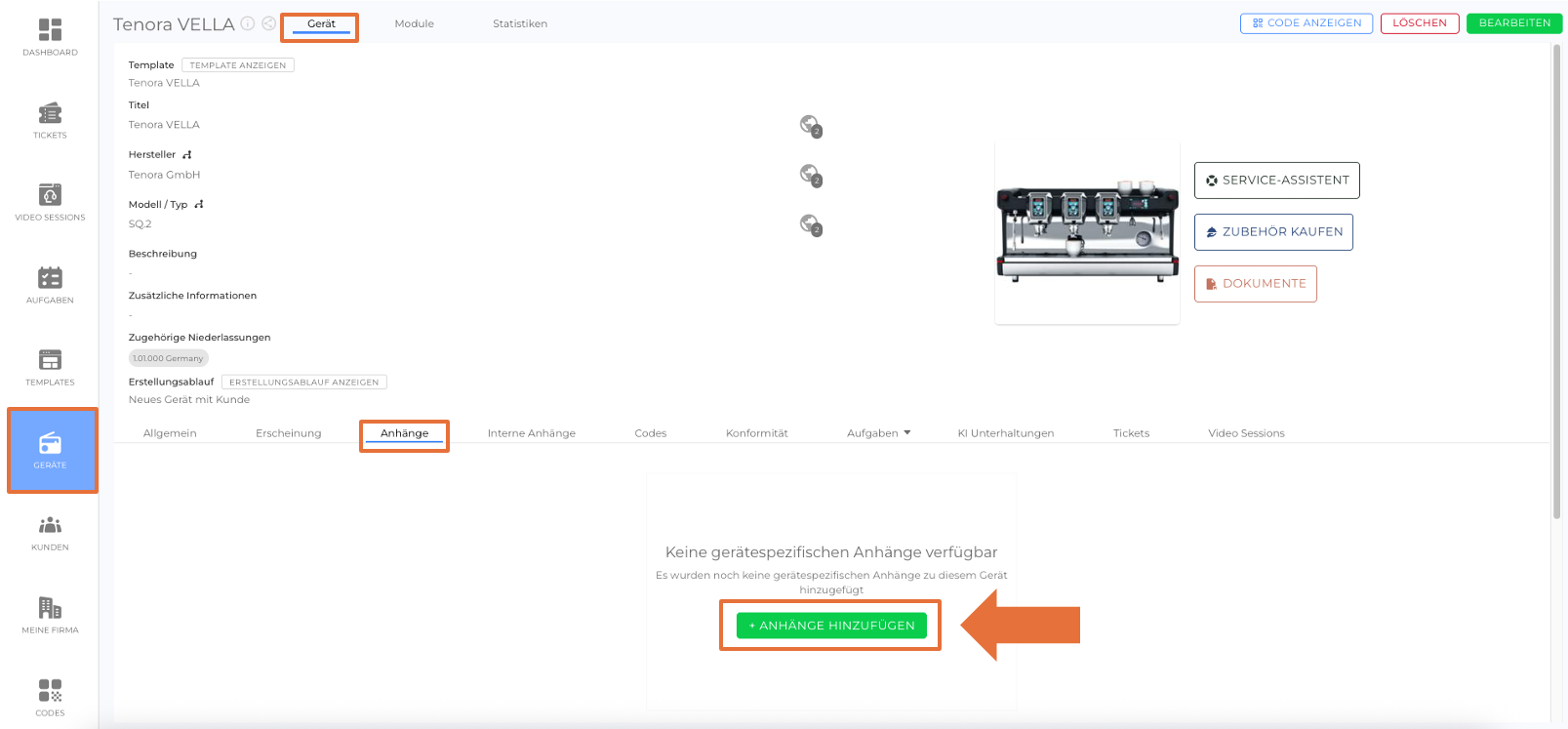 Anhänge-Tab: Zeigt gerätespezifische Anhänge sowie Anhänge an, die vom Template vererbt wurden, wie Bilder, PDFs oder Videos.