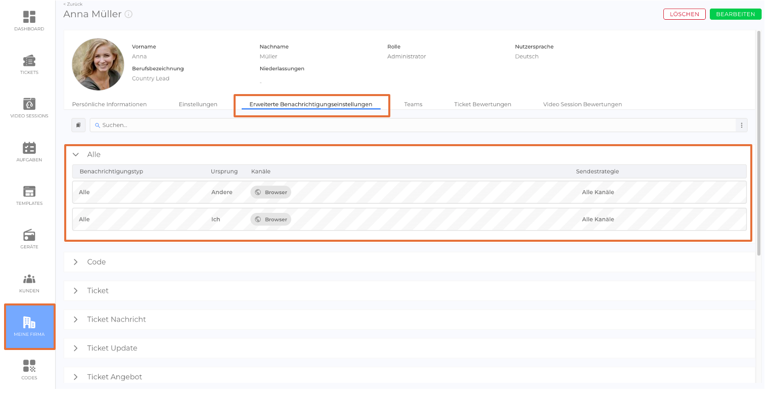 Die Erweiterten Benachrichtigungseinstellungen ermöglichen es Nutzern, festzulegen, wie und wann sie Benachrichtigungen für verschiedene Ereignisse erhalten. Dabei können folgende Einstellungen angepasst werden: