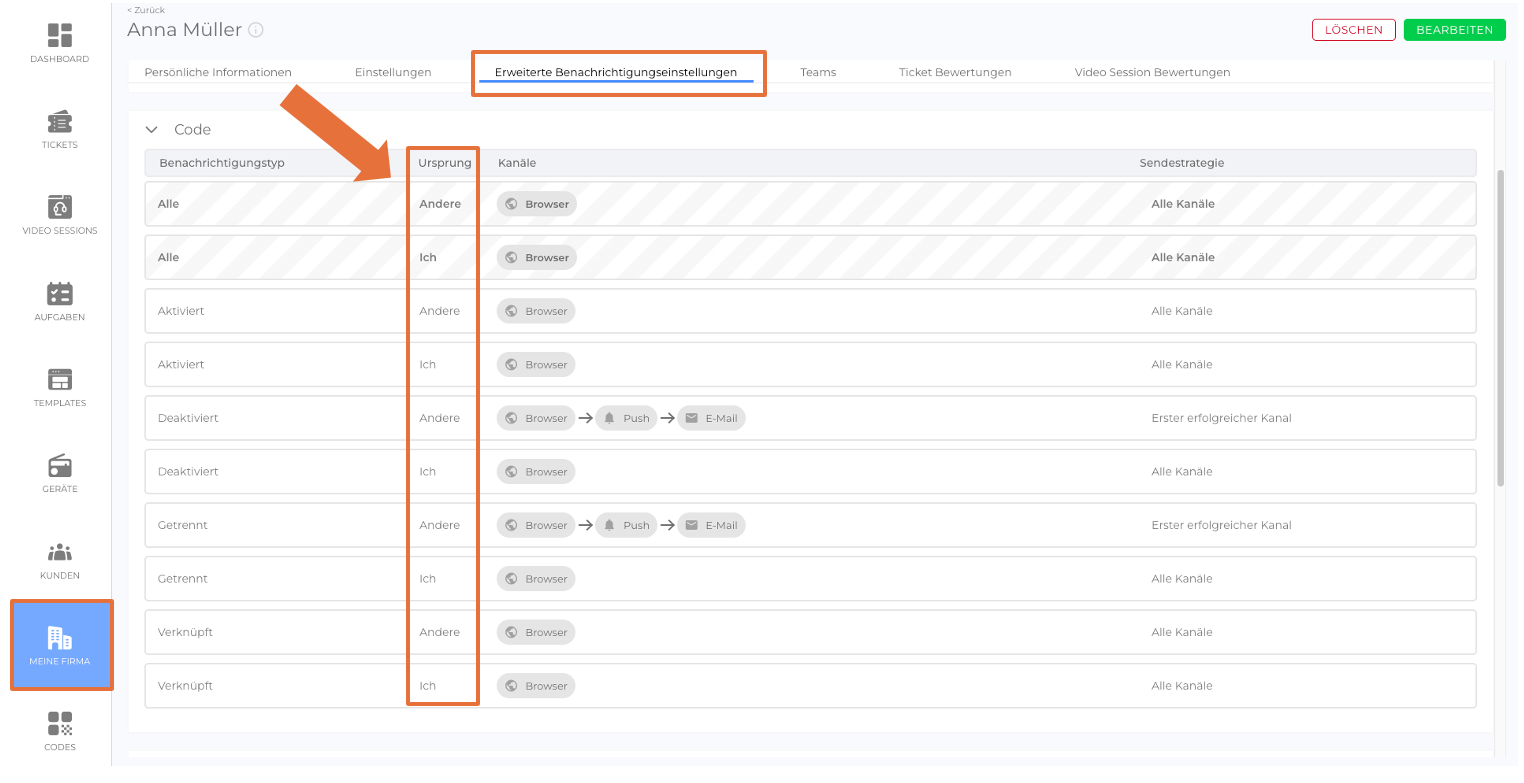 - Die Benachrichtigungskanäle für jedes Ereignis (z. B. Browser, Mobile Push, E-Mail).
