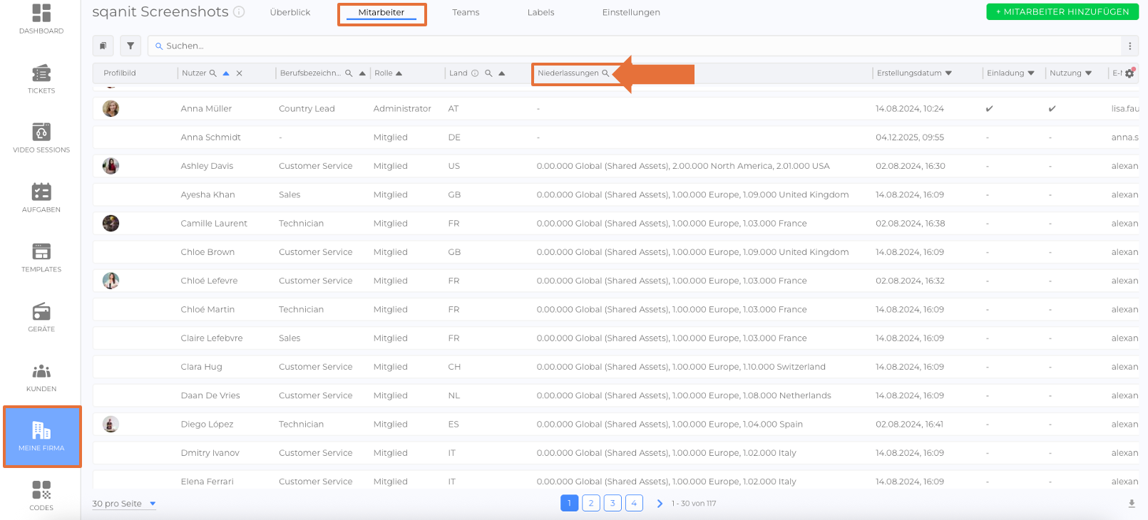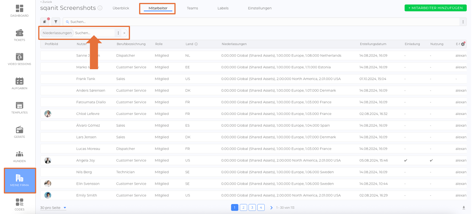 In Listen mit Mitarbeitern und Customer-Login-Mitarbeitern ist es nun möglich, direkt in der Spalte „Niederlassungen“ mit einer Suchleiste gezielt nach Niederlassungen zu suchen.