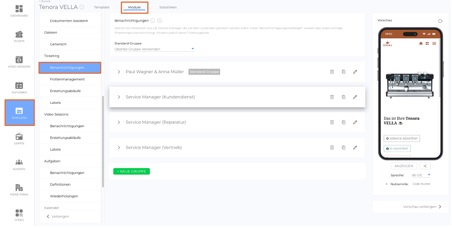 Jeder Ticket-Erstellungsprozess wird einer bestimmten Benachrichtigungsgruppe zugewiesen. Es können nur Gruppen aus demselben Template zugewiesen werden. Wenn keine spezifische Gruppe ausgewählt wird, erhält die Standardgruppe die Benachrichtigungen. (Bild)
