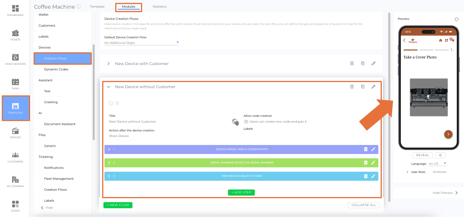- Erstellung: Geräte-Erstellungsabläufe werden auf Template-Ebene erstellt und verwaltet.