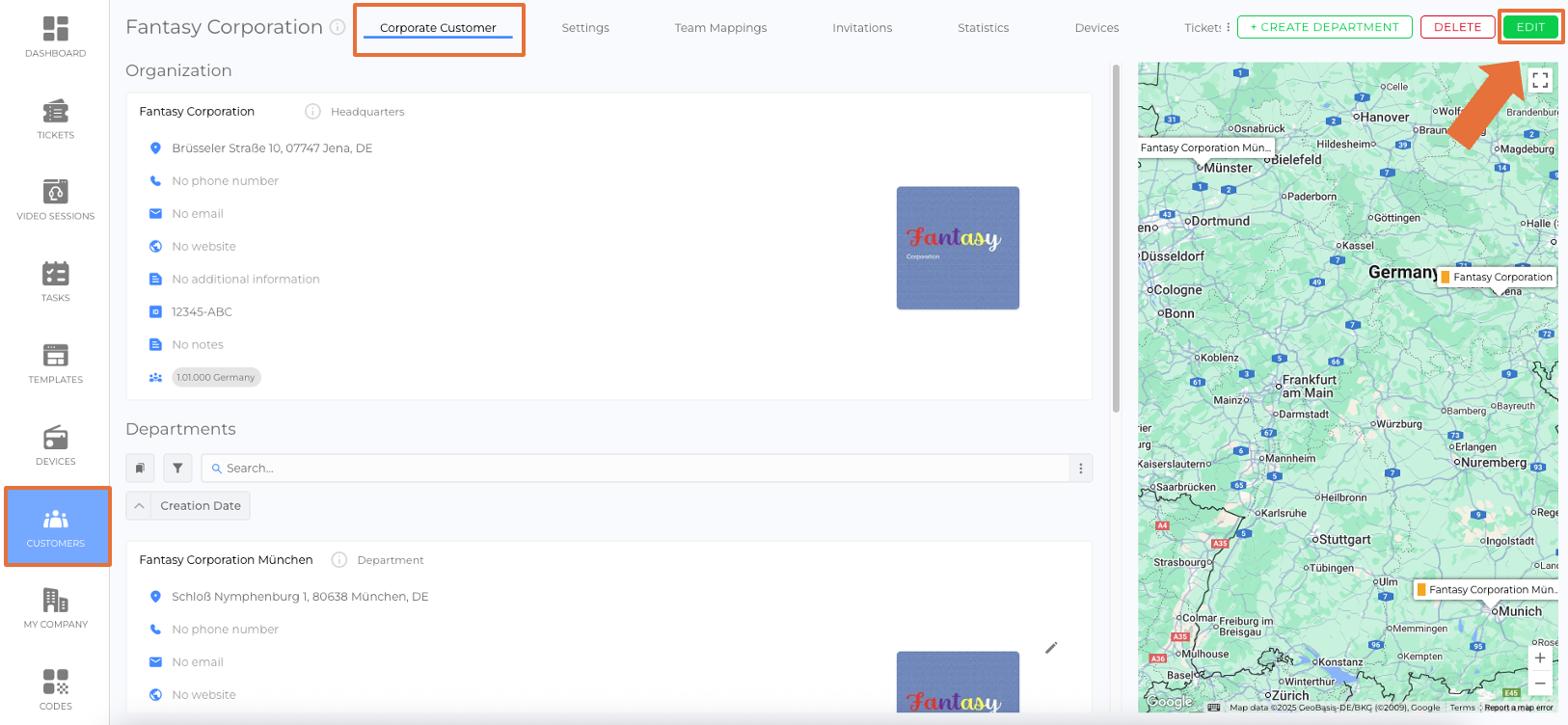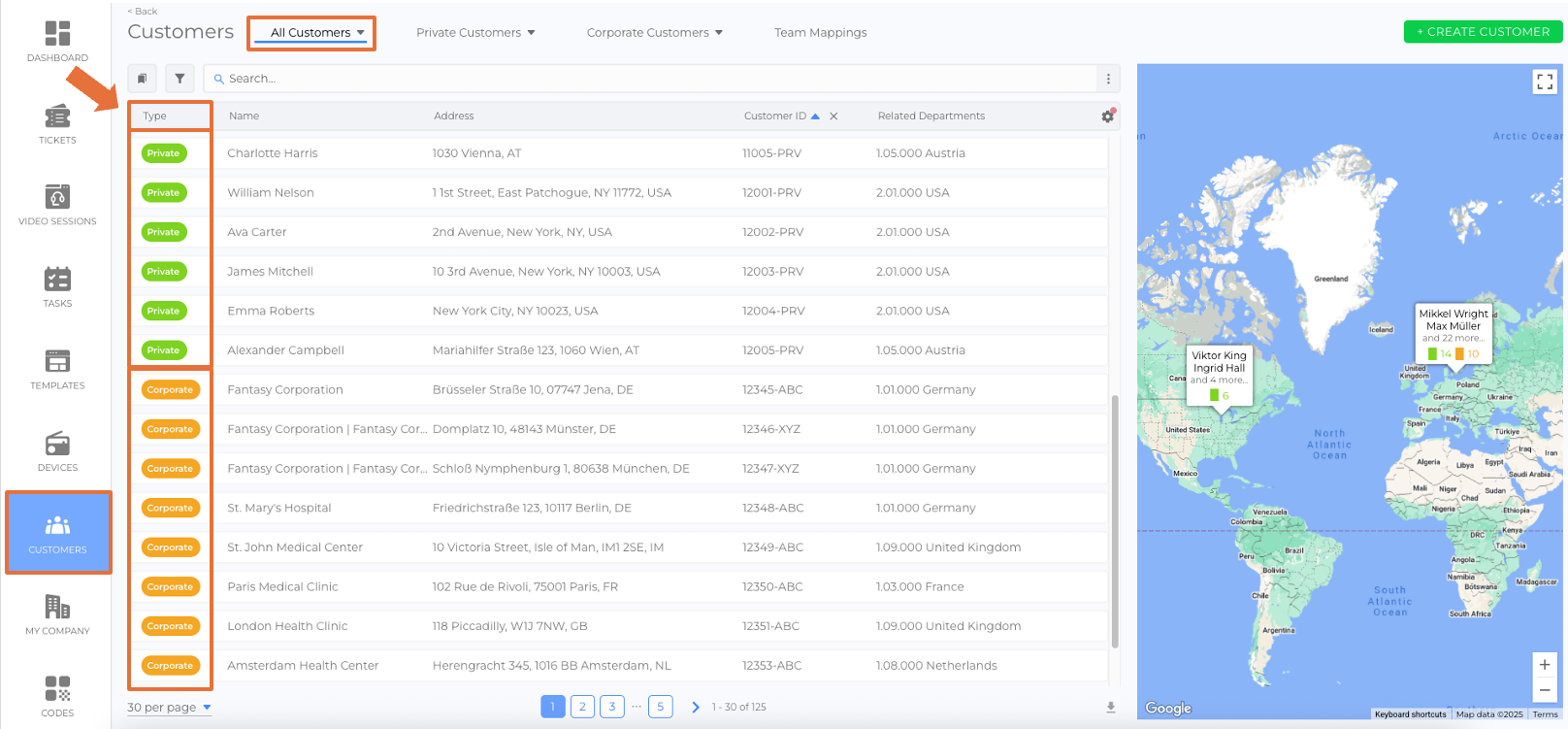 - Corporate Customers: These customers can have a headquarters and may have departments, each with unique information and contact details. It is identified with an orange color tag in the Customers list view.